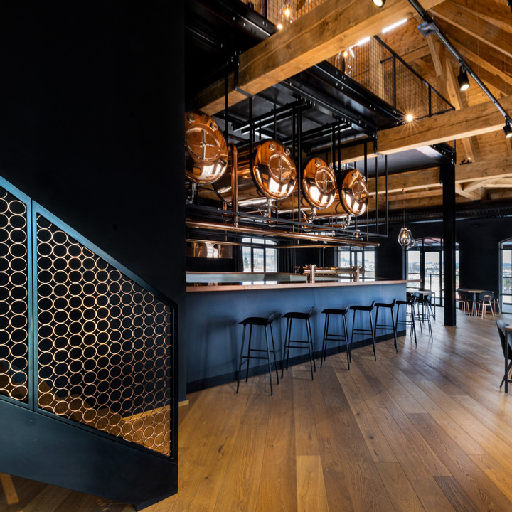 Architektonický skvost: Interiér, který získal řadu ocenění, citlivě propojuje historický odkaz pivovarnictví s vizí 21. století. Host u nás sedí přímo nad pivovarem, v centru dění.