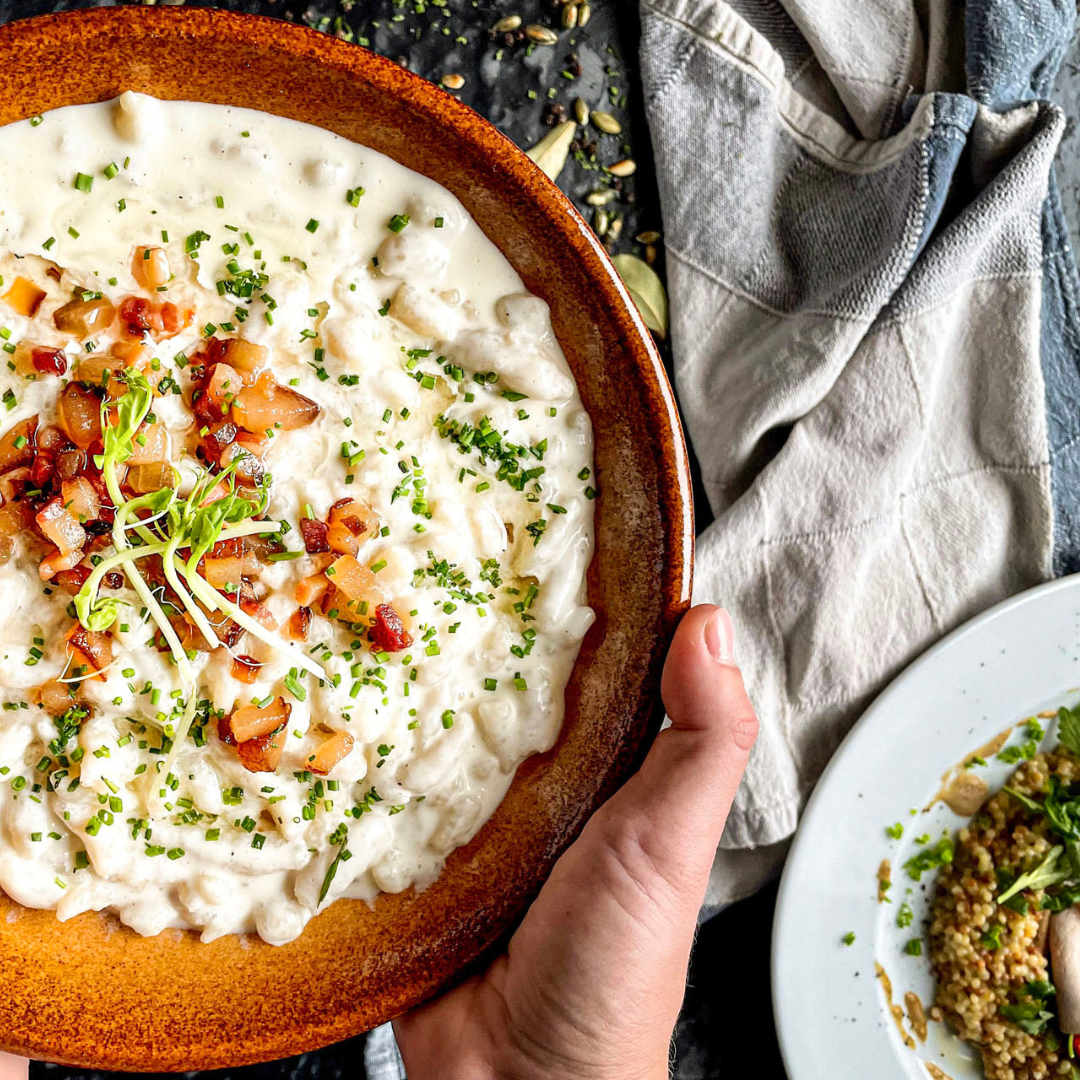 Grilovaná krkovice s ragú z restované slaniny a květáku, silná vepřová omáčka a náš kváskový chléb z pece