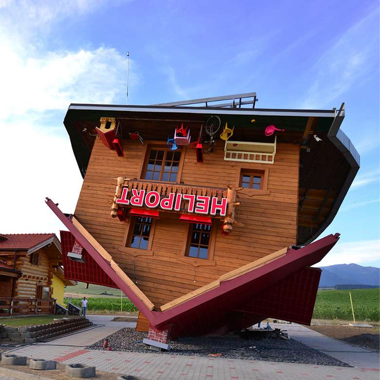 Zábavná atrakce nejen pro děti. Celý dům je postaven tak, že návštěvníci chodí po „stropě“ a nábytek visí dolů. Ideální místo na bláznivé fotky a trénink prostorové orientace.